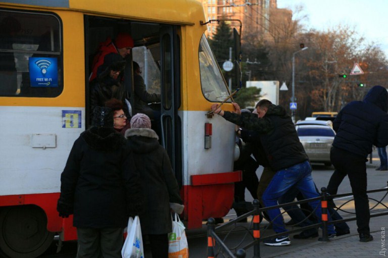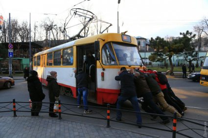 Пасажирам трамвая довелося вийти з вагона і штовхати вагон на розворотному кільці в Аркадії.