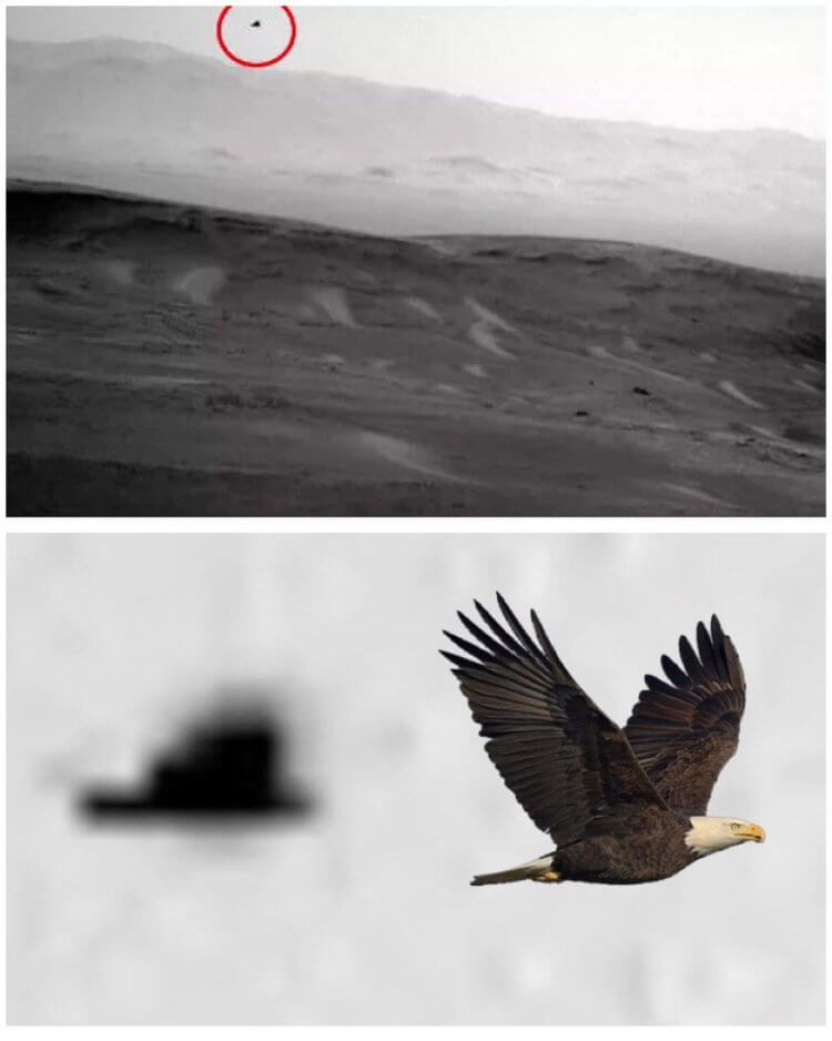 Цього разу уфологи не стали шукати в неопізнаному об’єкті інопланетян або вчергове заявляти про «доведення існування життя на Марсі». Знімок проаналізував уфолог Скотт Уоррінг, який заявив, що дивний об’єкт на фото дуже схожий на ширяючого в небі орла. Невже NASA дійсно нас обманює, або у кого-то просто розігралася дуже сильне уяву?