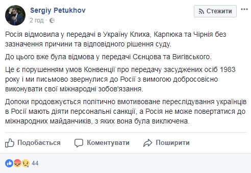 «Росія відмовила у передачі в Україну Клиха, Карпюка та Чірнія без зазначення причини та відповідного рішення суду. До цього вже була відмова у передачі Сєнцова та Вигівського», – йдеться в повідомленні.
