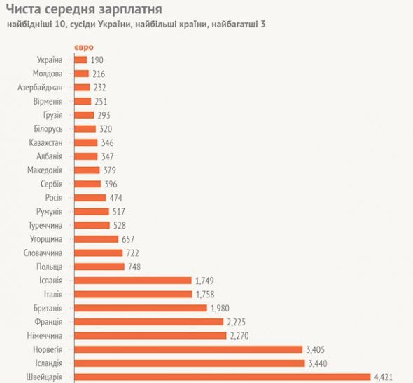 В середньому українці отримують чисту (на руки) зарплату в розмірі 190 євро (6048,04 за курсом НБУ).