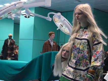 Креативний директор Gucci, модельєр Алессандро Мікеле представив подіумний простір у вигляді операційної палати із хірургічним столом посередині. «Наша робота – це хірургічна робота: різання, збірка й експериментування на операційному столі», – заявив він.
