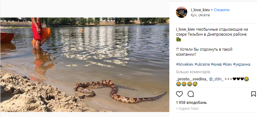 У Києві, на пляжі озера Тельбін відпочивальники помітили незвичайних відвідувачів. Фото двох плаваючих на березі озера пітонів з'явилися у Facebook в групі «Наш дом Березняки» та в Instagram.