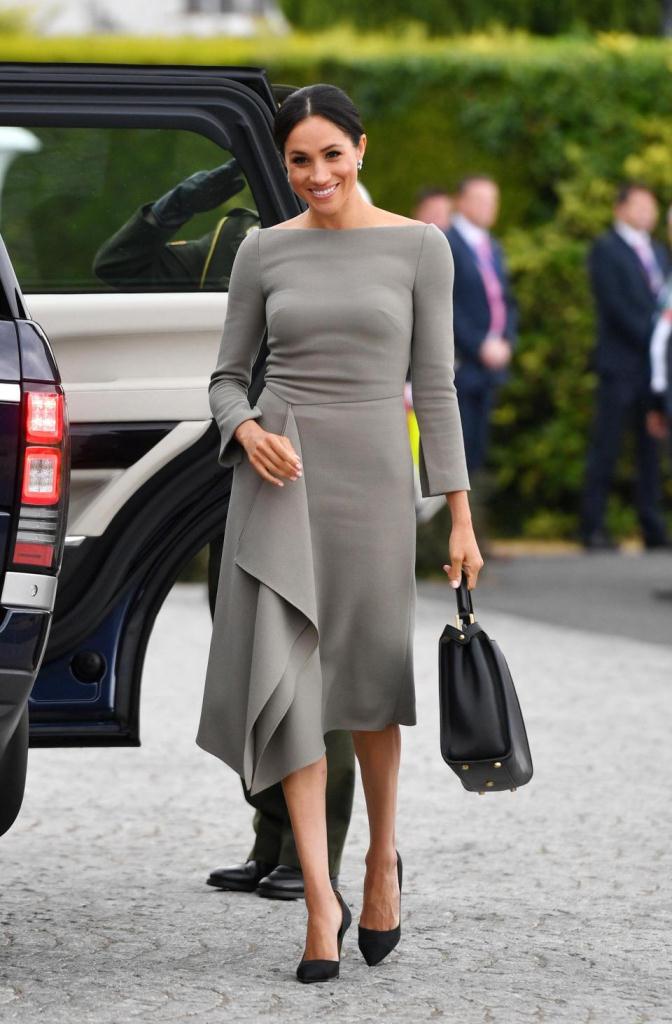 Раніше, дружину принца Гаррі сфотографували в сірій сукні Rolan Mouret з вирізом і в класичних туфлях-човниках Manolo Blahnik.