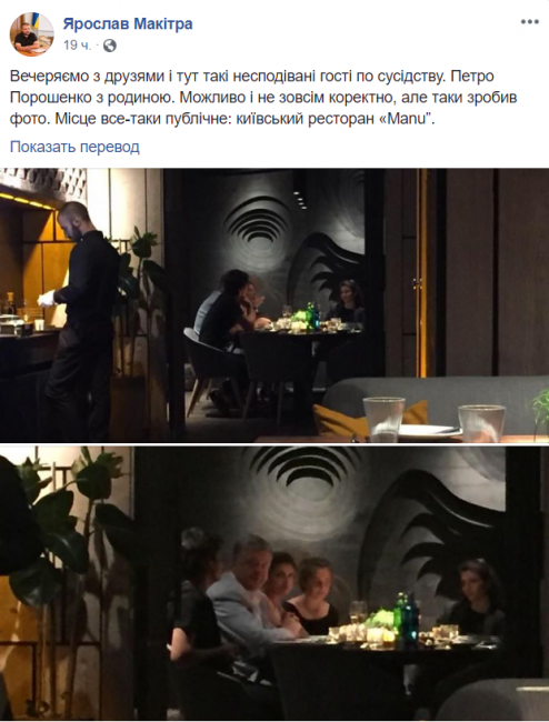 «Вечеряємо з друзями і тут такі несподівані гості по сусідству. Петро Порошенко з родиною. Можливо, і не зовсім коректно, але таки зробив фото. Місце все-таки публічне: київський ресторан "Manu"», – написав він.