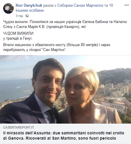 «Чудом вижили. Помолімся за наших українців Євгена Бабіна та Наталю Єліну з Санта-Марія К. В. (провінція Казерти), які ЧУДОМ ВИЖИЛИ у трагедії в Генуї. Впали машиною з обваленого мосту (більше 80 метрів) і зараз перебувають у лікарні «Сан-Мартіно», – написав він у своєму Facebook.