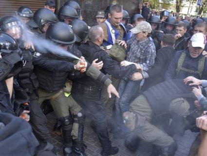 В «Твітері» і «Фейсбуку» останніх кілька днів гуляє фотографія, на якій співробітник поліції випадково бризкає собі в лице із газового балончика. Зроблене це знакове фото під час недавніх протестів активістів під стінами ГПУ у Києві, а саме 17 вересня. Очевидно, силовик мав намір націлити струмінь перцевого спрею у бік протестувальників, які штурмом брали прокуратуру, та щось пішло не так…
