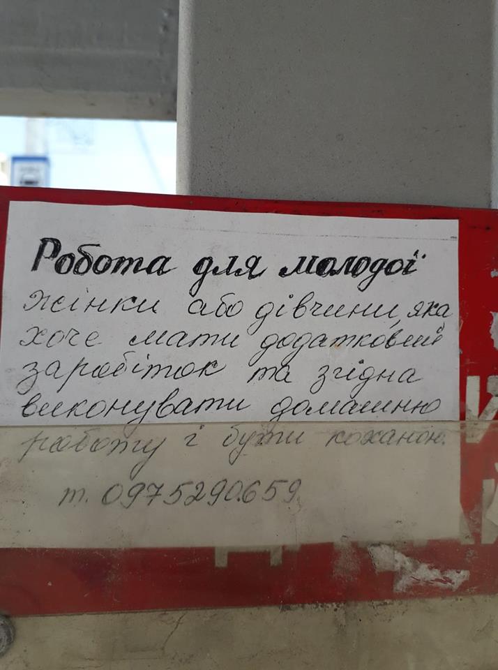 «Для тих, хто в пошуку роботи», - прокоментувала світлину Тетяна, адже в тексті оголошення і дійсно пропонують «роботу для молодої жінки або дівчини, яка хоче мати додатковий заробіток та згідна виконувати домашню роботу і бути коханою».