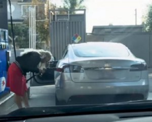 Автолюбителька хотіла залити бензин в електромобіль Tesla. Забавні кадри зняли чоловіки, які сиділи у машині позаду блондинки і чекали своєї черги.