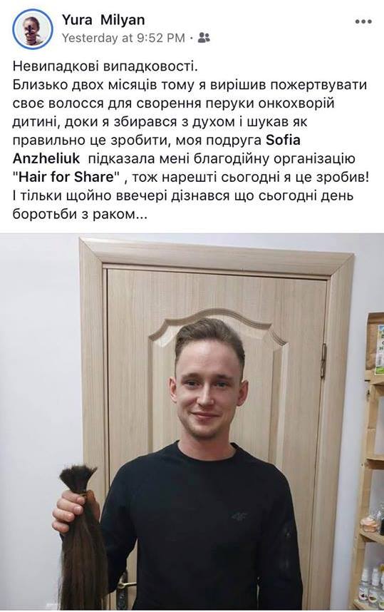 «Невипадкові випадковості. Близько двох місяців тому я вирішив пожертвувати своє волосся для створення перуки онкохворій дитині, доки збирався з духом і шукав, як правильно це зробити, моя подруга підказала мені благодійну організацію Hair for Share, тож нарешті сьогодні я це зробив! І тільки щойно ввечері дізнався, що сьогодні День боротьби з раком…» – йдеться в дописі.