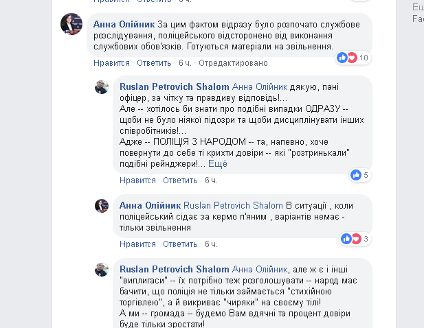 Прес-офіцер Нацполіції у Вінницькій області Анна Олійник підтвердила факт інциденту. За її словами, одразу було розпочато службове розслідування, а поліцейського відсторонено від виконання службових обов'язків. Наразі готують матеріали на звільнення.