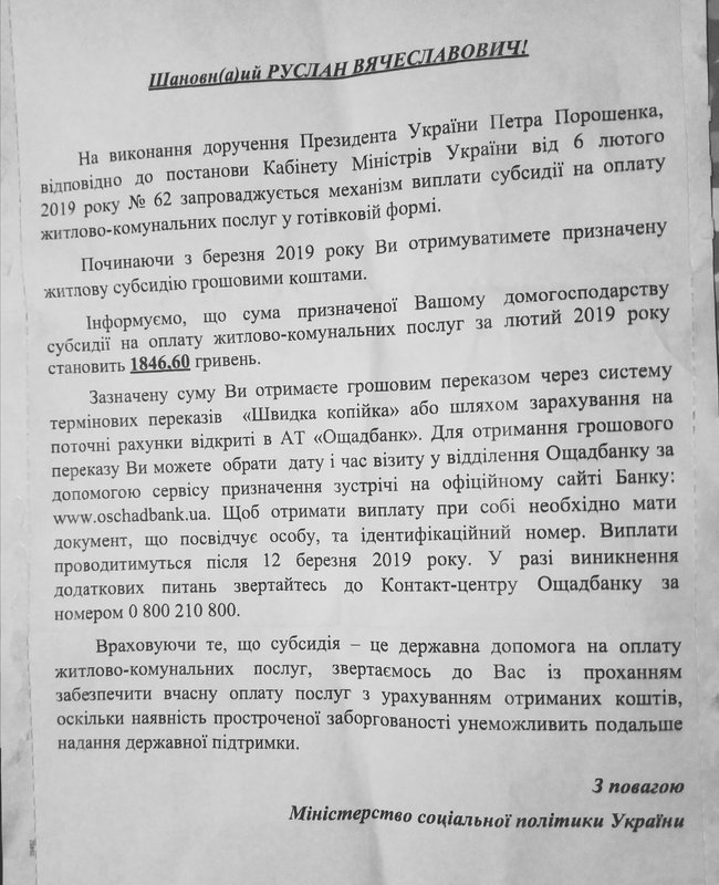 Українцям почали надходити повідомлення від Міністерства соціальної політики про виплату субсидій у готівковій формі, пише «Цензор.нет».