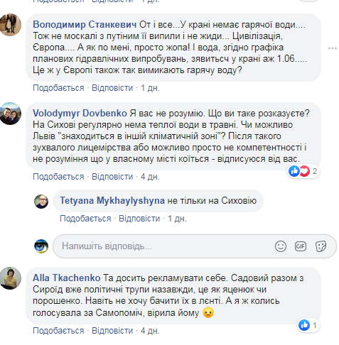 Натомість теперішнє відключення горячої води ще раз довело, що Львів не виняток з правил. Жителі міста обурюються, що гаряча вода - розкіш для Львова, адже її часто немає. Відключення ж води в таку несприятливу погоду, коли опади та можливі заморозки на Львівщині люди вважають безвідповідальністю.