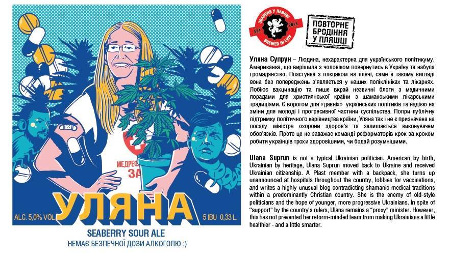 Нагадаємо, хто не в курсі: Уляна Супрун – американка за походженням, яка вирішила повернутися з чоловіком в Україну. Деякі ментальні цінності і свої погляди вона прагне прищепити нашому суспільству. На етикетці Супрун зобразили в оточенні таблеток і з кущем конопель у руках. Це безневинний шарж на часами засучасні для українців пости на сторінці в. о. міністерки у Facebook.
