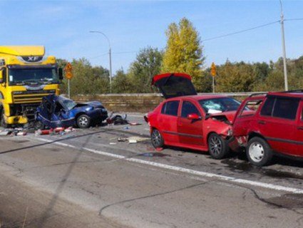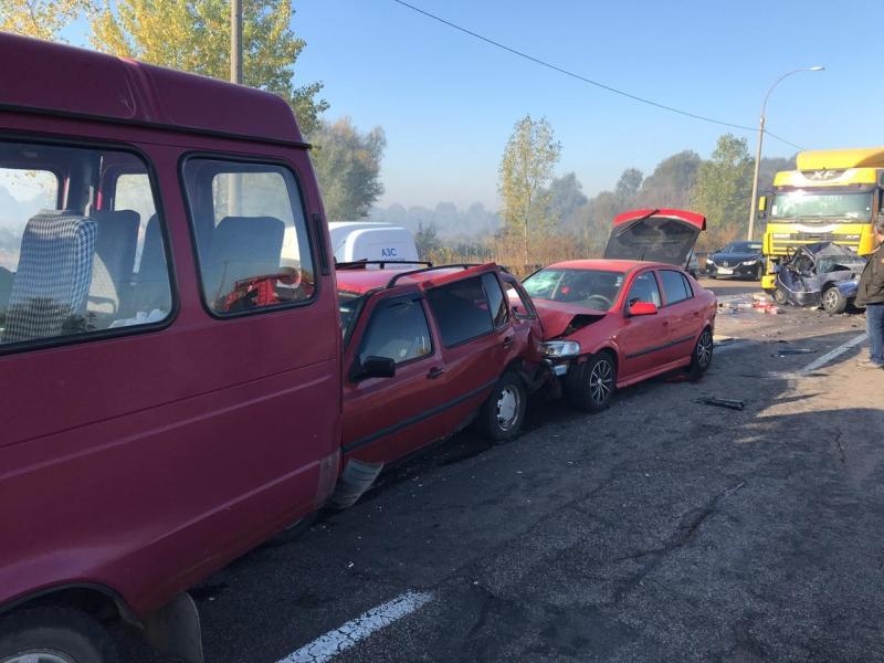 У Броварському відділі поліції повідомили, що в одній аварії зіткнулися відразу шість автомобілів: фура DAF, Daewoo Nexia, Opel Astra, Volkswagen Golf і «Газель», передають «Факти».