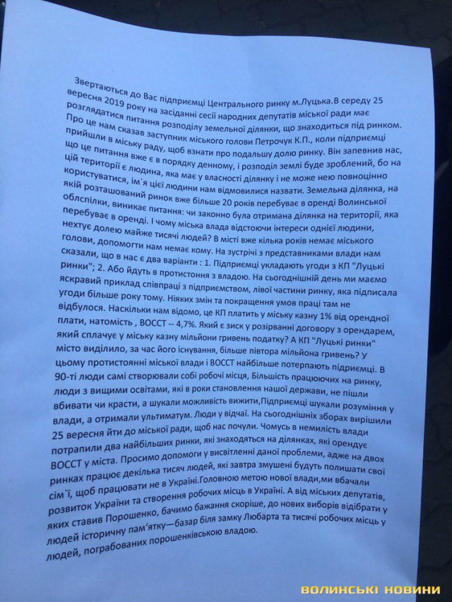 У роздаткових матеріалах, які мають підприємці вони зазначають: «Від міських депутатів, яких ставив Порошенко, бачимо бажання скоріше, до нових виборів відібрати у людей історичну пам‘ятку – базар біля Замку Любарта та тисячі робочих місць у людей, пограбованих порошенківською владою».
