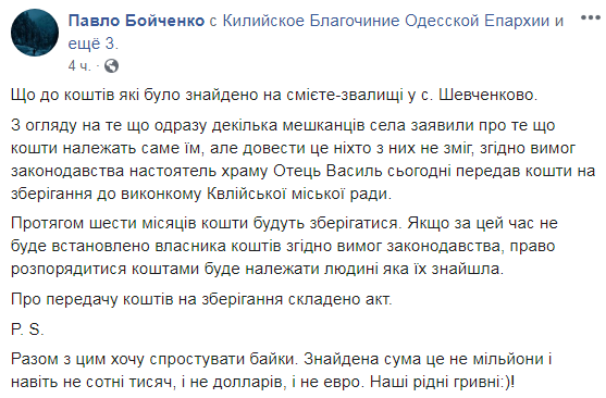 "З огляду на те, що відразу кілька жителів села заявили про те, що кошти належать саме їм, але довести це ніхто з них не зміг, відповідно до вимог законодавства, настоятель храму отець Василій передав кошти на зберігання. Протягом шести місяців кошти будуть зберігатися" , – пообіцяв він.