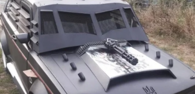 Старому радянському автомобілю встановили "жалюзі" на вікнах і кулемет на капоті.