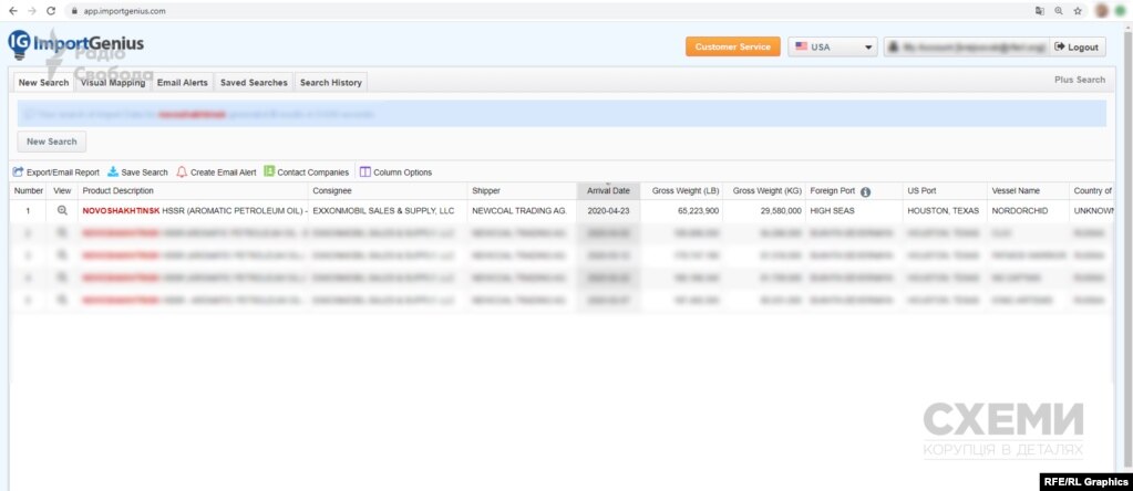 Перебування поруч із танкерами не означає, що саме з них завантажили продукцію. Однак дані аналітичного ресурсу Import Genius – міжнародної бази, яка збирає і аналізує операції імпорту-експорту – допомогли встановити походження вантажу. Там чітко зазначено, що судно Nordorchid доправило у Х'юстон продукцію саме «Новошахтинського заводу». Отримувач – ExxonMobil Sales and Supply LLC.