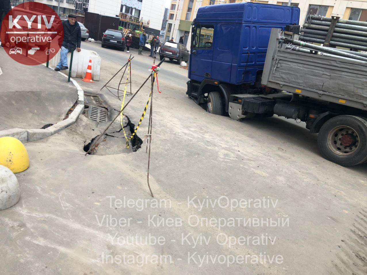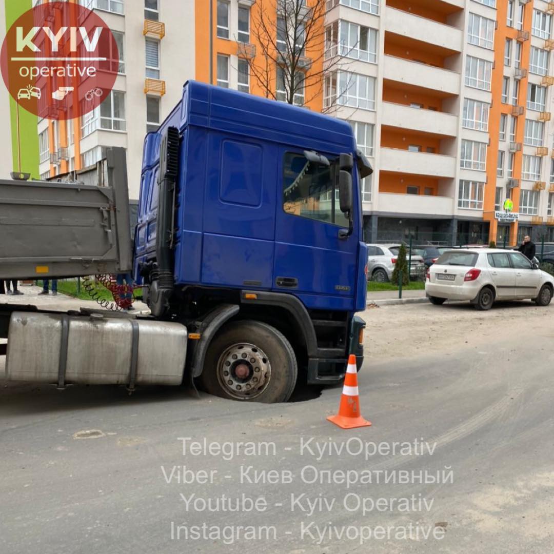 У Києві на проспекті Перемоги, 67 вантажівка провалилася в яму, яка утворилася через прорив опалення.