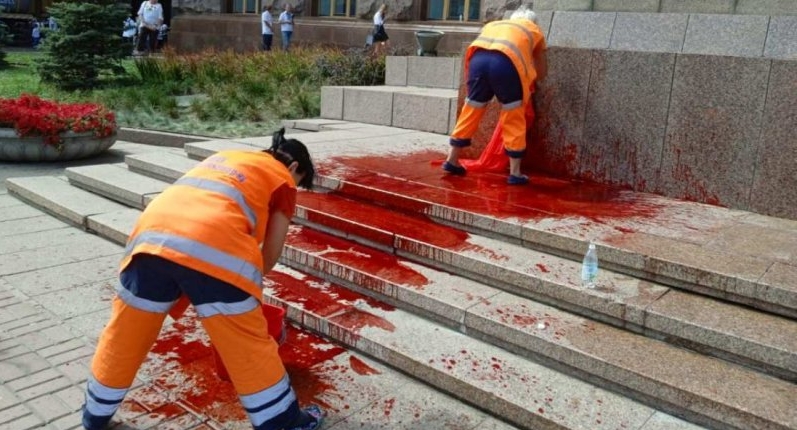 У Києві на Хрещатику біля будівлі КМДА після завершення офіційних заходів до Дня незалежності невідомий облив сходи червоною фарбою.