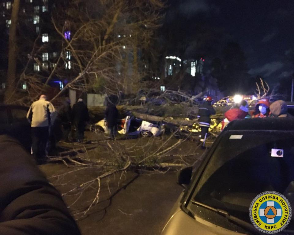 О 20:47 рятувальники "Київської служби порятунку" та ГУ ДСНС в м. Києві прибули на вул. Верховинну, 35. За цією адресою внаслідок падіння дерева на автівку постраждали двоє людей. Постраждалих деблоковано, одну людину госпіталізовано.