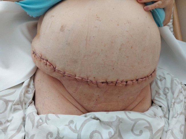 Він розповів, що оперативне втручання провели під загальним знеболенням. Виконали герніопластику, тобто, видалили килу і абдомінопластику (пластику живота). За його словами, загалом видалили понад 15 кілограмів зайвої шкіри та жиру. Загальний стан хворої покращився, її виписали додому, почувається добре.
