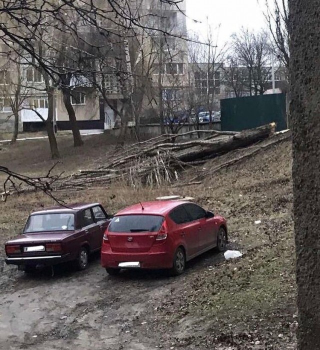 У Нововолинську на 15 мікрорайоні через потужний вітер тополя впала на припаркований автомобіль.