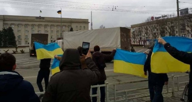 Жителі Херсона вийшли зустрічати "гуманітарну допомогу" від РФ із українськими прапорами.