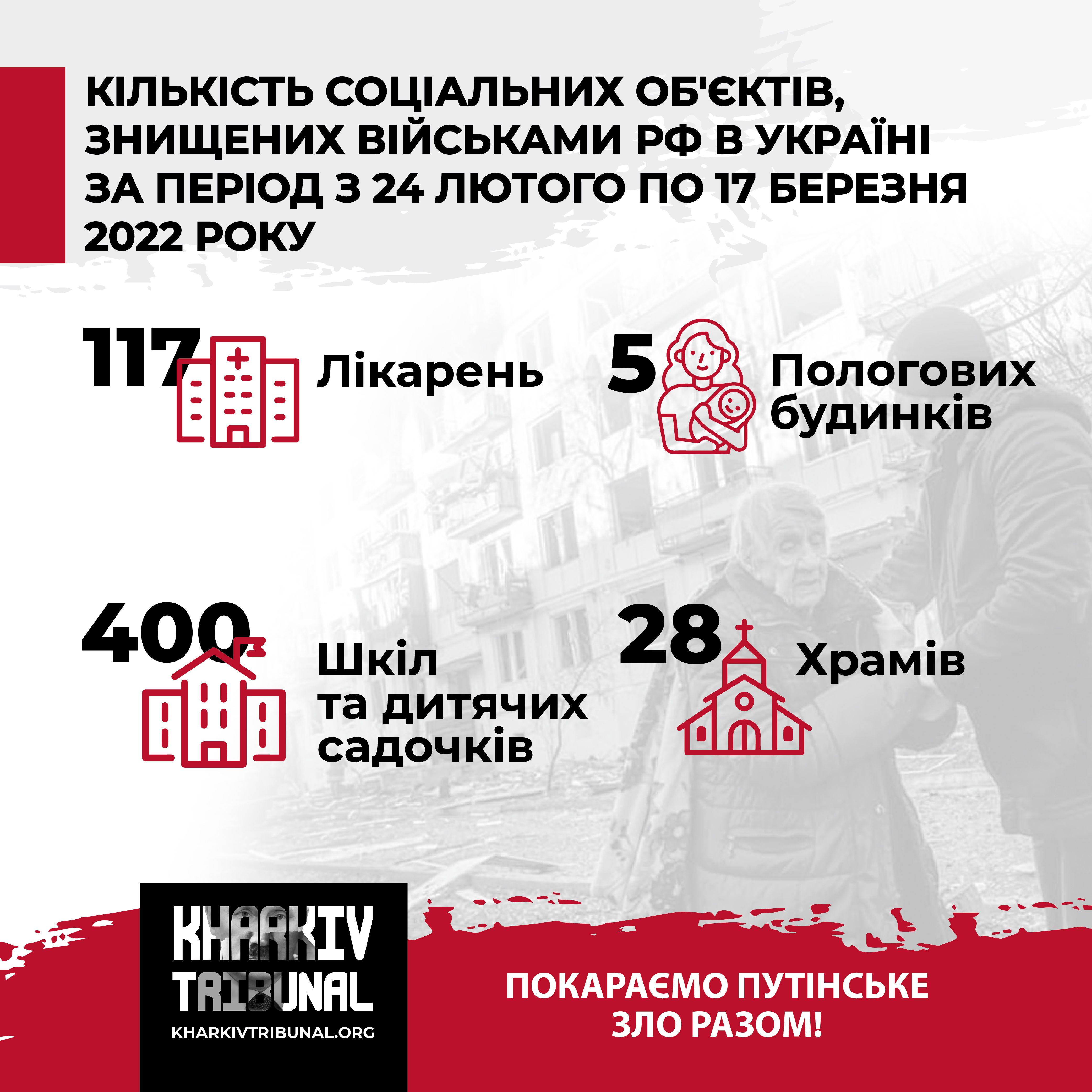 Зокрема, за даними «Нюрнберг 2022», від 24 лютого до 17 березня 2022 року через російські обстріли та бомбові удари зруйнувано 117 лікарень та 5 пологових будинків. Пошкоджено або повністю розтрощено 400 шкіл та дитячих садочків. Постраждало 28 храмів, більшість з яких – УПЦ Московського патріархату.