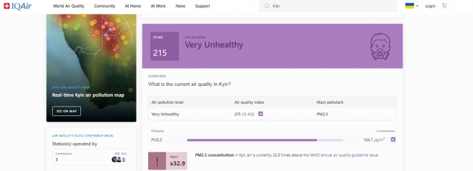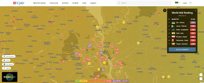 За забрудненістю повітря Київ опинився на першому місці у світі, обійшовши Лахор (Пакистан) та Дакку (Бангладеш).
