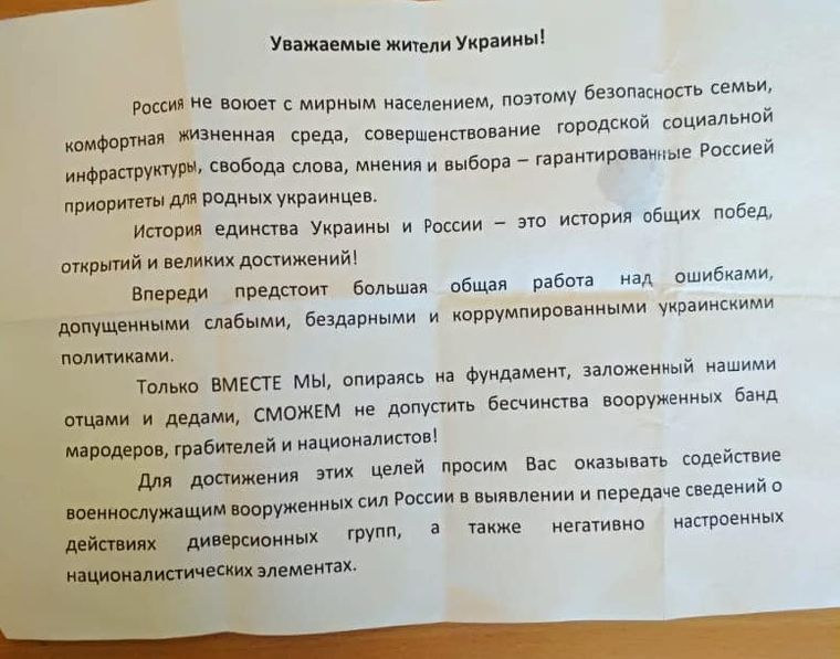 Так звані листівки «до братів слов'ян» розповсюджують у прикордонних населених пунктах. Окупаційні сили рф заявляють, що «не допустять безчинства мародерів, грабіжників та націоналістів».