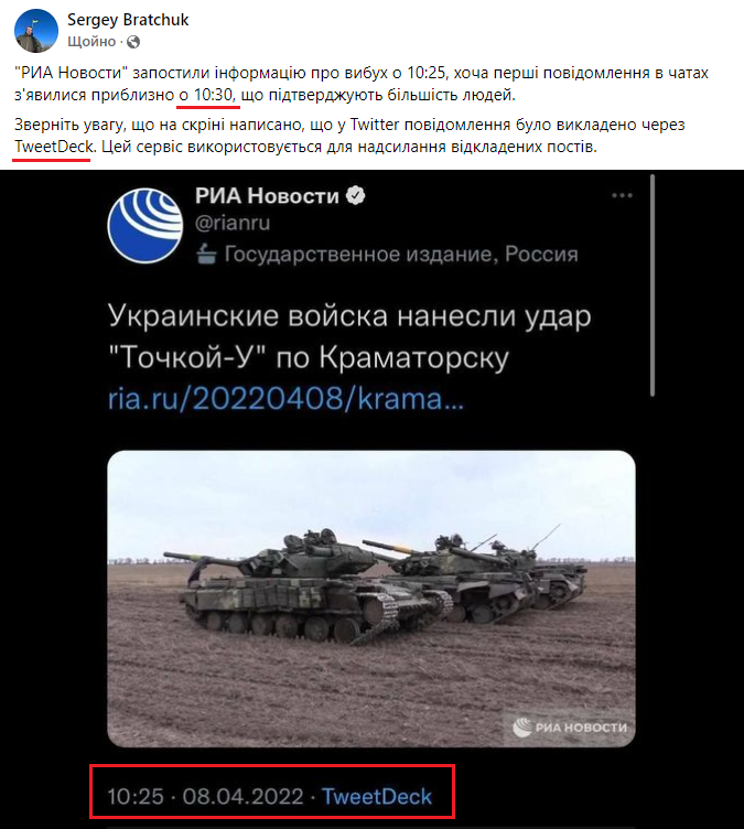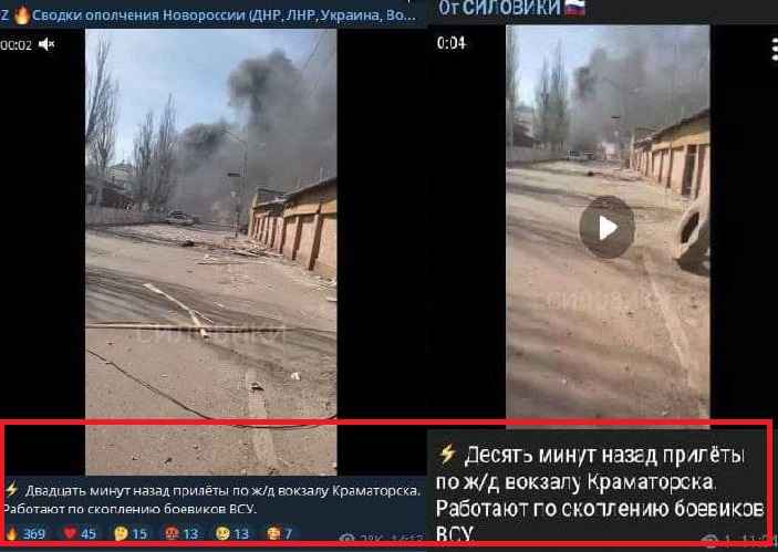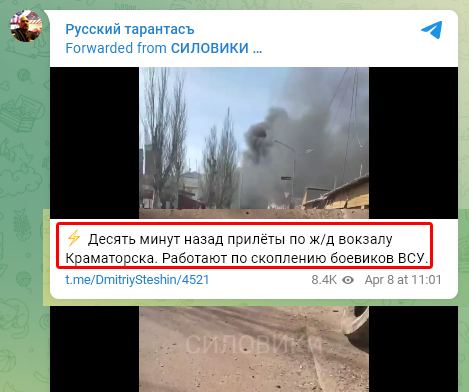 "Як завжди, одразу після удару по вокзалу Краматорська, росіяни похвалилися цим «подвигом» у соцмережах. Вони вважали, що потрапили по наших військових. Повідомлення про це розмістив популярний телеграм-канал «Силовики», а репост на канал «Російський тарантас» зробив російський пропагандист Дмитро Стешин. Як тільки стал