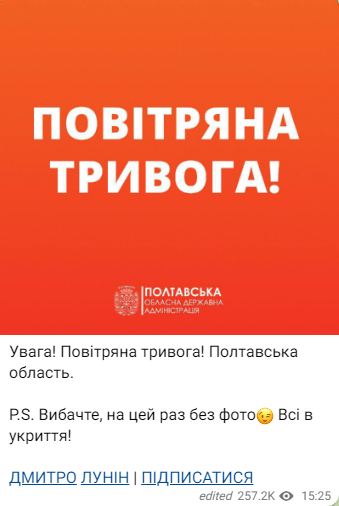 Але Лунін не розгубився, і наступного разу, коли публікував фото про нову повітряну тривогу, потролив сам себе і заявив, що цього разу без особистих фото.