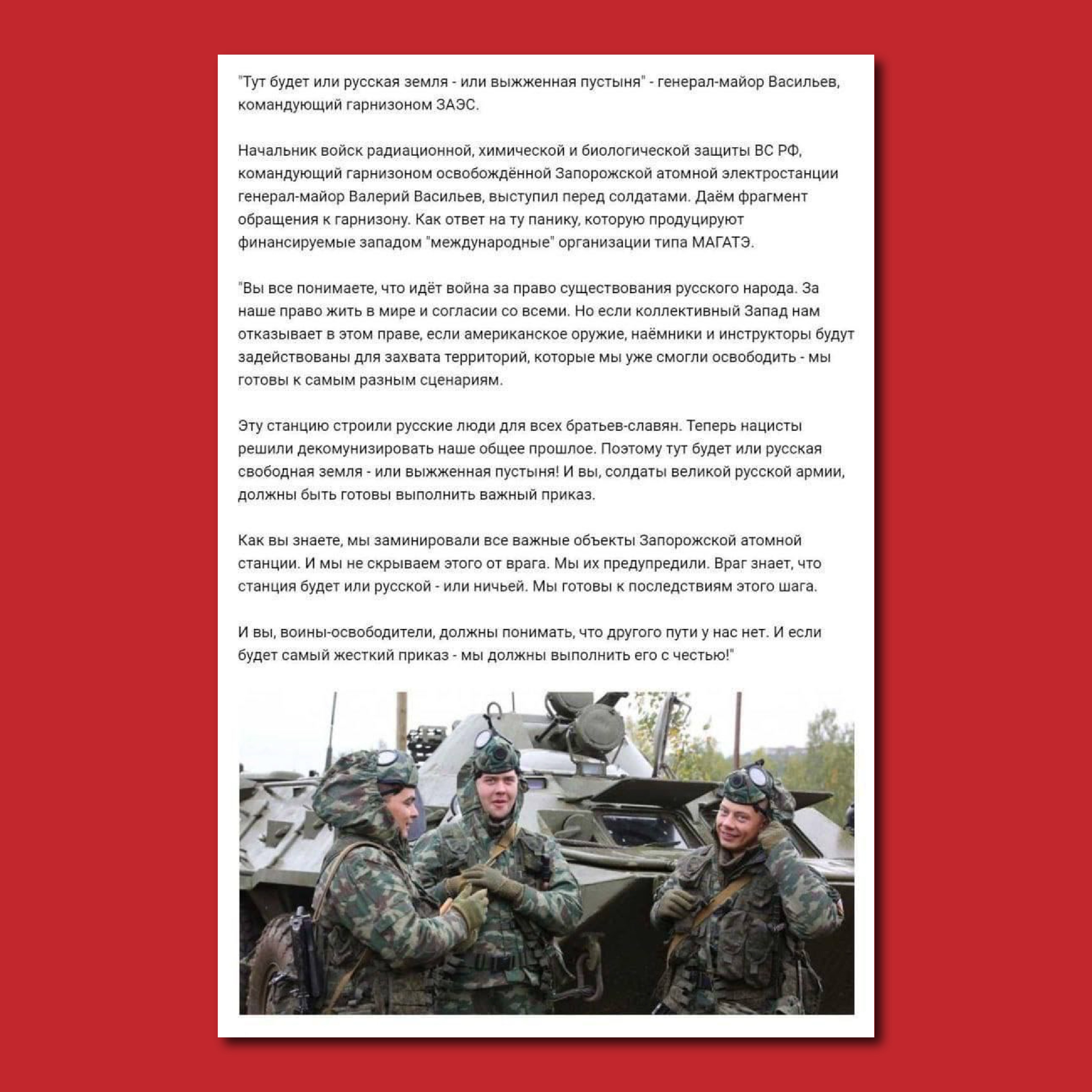 Там запевняють, що начальник військ радіаційного, хімічного та біологічного захисту ЗС рф генерал-майор Валерій Васильєв, котрий зараз командує гарнізоном ЗАЕС, сказав своїм солдатам, що "тут буде або російська земля, або випалена пустеля".