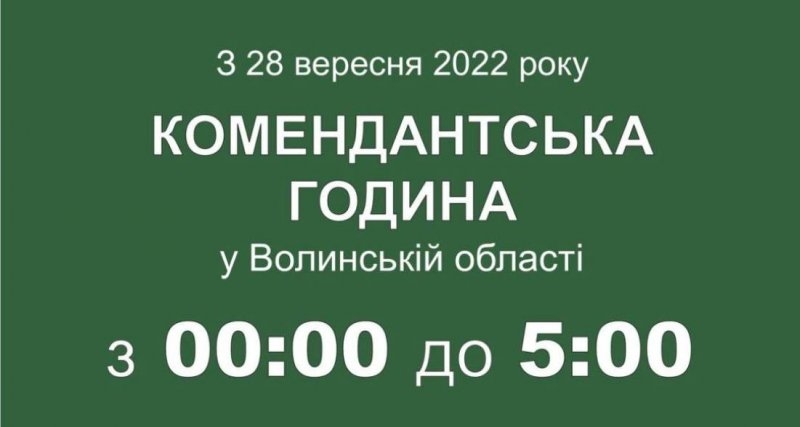 "Від сьогодні, 28 вересня 2022 року, на Волині змінено час комендантської години. Зокрема, комендантська година триватиме з 00:00 години до 05:00 години.