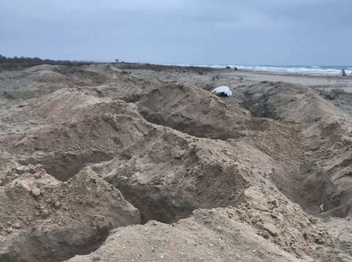 "росіяни в окупованому Криму намагаються додатково укріпити берегову лінію, побоюючись висадки українського десанту. Зокрема, вздовж берега поблизу села Молочне (Сакський район) обладнується мережа мінних загороджень, окопів та траншей", - йдеться в повідомленні.