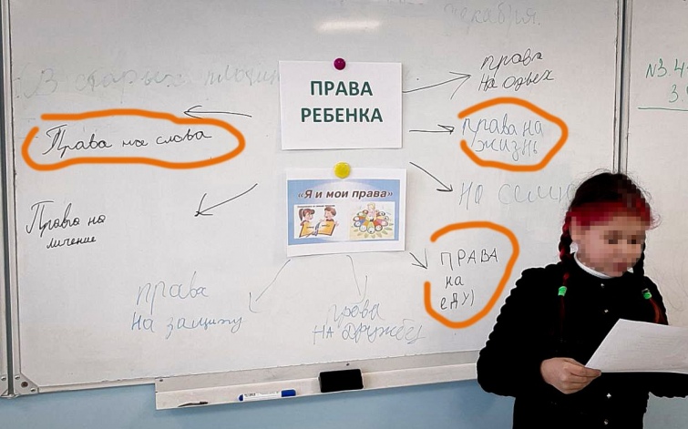 Паралельно, за даними Андрющенка, у маріупольських школах колаборанти проводять уроки на тему "Права дитину". Школярі самостійно визначали свої права і записували їх на дошці. Одне з оприлюднених радником мера фото – яскраве свідчення того, чого не вистачає дітям в окупації. Це, зокрема – "право на їжу". А також права на життя, слово, одяг, лікування та захист.