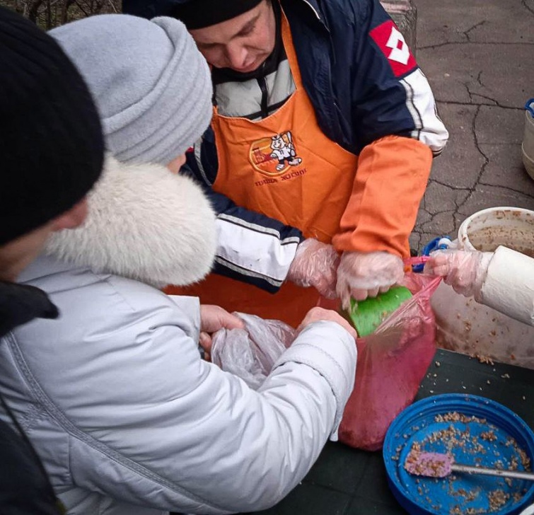 У чергах за їжею стоять і дорослі, і діти, і люди похилого віку. На одній зі світлин можна побачити, як жінці насипають кашу у пакет.