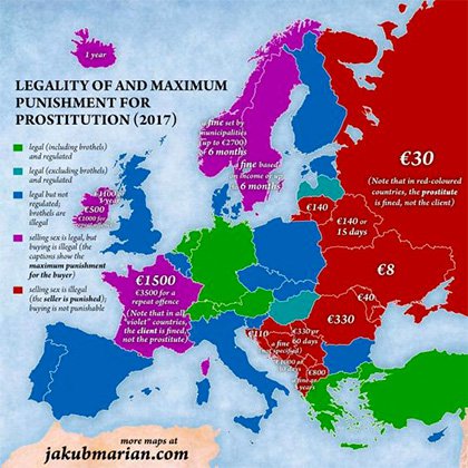 На карті зеленим кольором позначено країни, в яких найдавніша професія легалізована. У них повії можуть отримувати ліцензію на роботу і реєструватися як спеціалісти. Вони можуть також офіційно влаштуватися в будинок розпусти, в якому діють загальноприйняті трудові правила. До таких країн належать Австрія, Німеччина, Греція, Угорщина, Латвія, Нідерланди, Швейцарія і Туреччина.