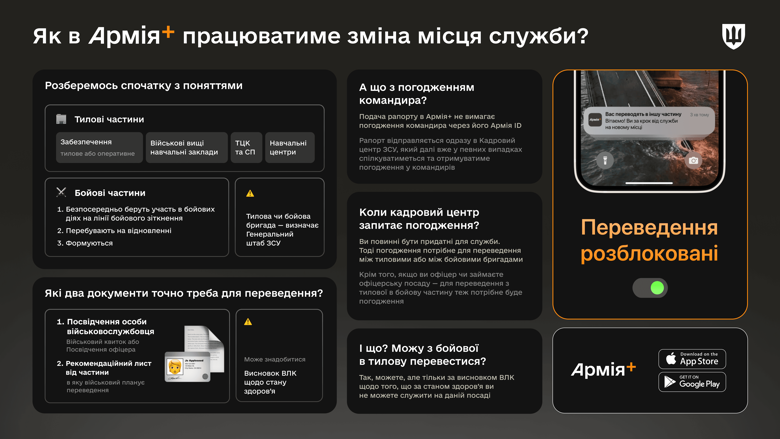 Після 72 годин результат повідомляється військовому через «Армію+». У разі погодження готується наказ на переведення, при відмові мають бути вказані чіткі причини. Усі підстави відмови визначено постановою Кабміну від 12.11.2024 №1291.