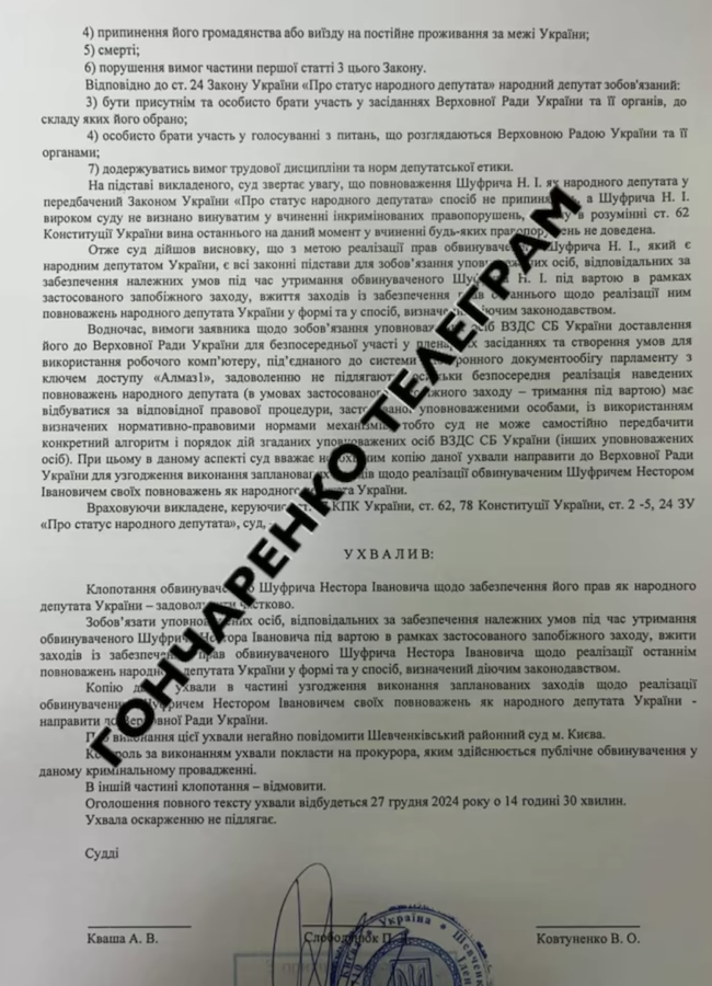 Зазначається, що Шуфрич подав клопотання, що хоче виконувати депутатські повноваження. Суд відмовив у тому, щоб він брав участь у засіданні Ради фізично, проте зобов?язав надати йому право виконувати депутатські повноваження в рамках його перебування в слідчому ізоляторі.