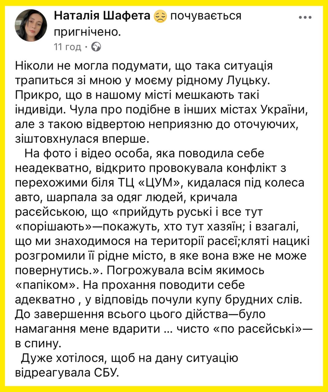 «Ніколи не могла подумати, що така ситуація трапиться зі мною у моєму рідному Луцьку. Прикро, що в нашому місті мешкають такі індивіди. Чула про подібне в інших містах України, але з такою відвертою неприязню до оточуючих зіштовхнулася вперше. На фото і відео особа, яка поводилася неадекватно, відкрито провокувала конфлікт з перехожими біля ТЦ «ЦУМ», кидалася під колеса авто, шарпала за одяг людей, кричала расєйською, що «прийдуть руські і все тут «порішають», і взагалі, що ми перебуваємо на території расєї. «Кляті нацикі» розгромили її рідне місто, в яке вона вже не може повернутися. Дуже хочеться, щоб на цю ситуацію відреагувала СБУ», – зазначила жінка.