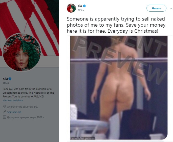 Проте Sia не піддалася на провокацію, натомість на офіційному акаунті в Twitter вона опублікувала оголене фото, яке шахраї надіслали їй з погрозами та вимогами.