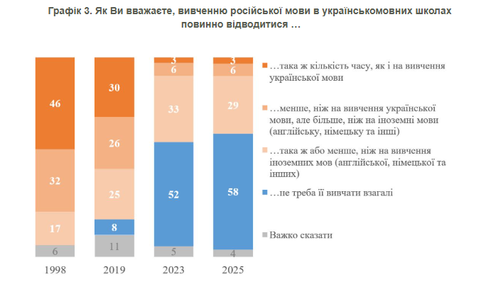 58% українців вважають, що російську мову взагалі не варто вивчати в україномовних школах. В 2023 році року таких було 52%.