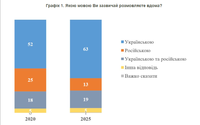 Опитування також показало, що 63% громадян спілкуються вдома українською мовою (у 2020 році таких було 52%). Спілкуються російською мовою – 13%, ще 19% відповіли, що однаково спілкуються українською та російською мовами.