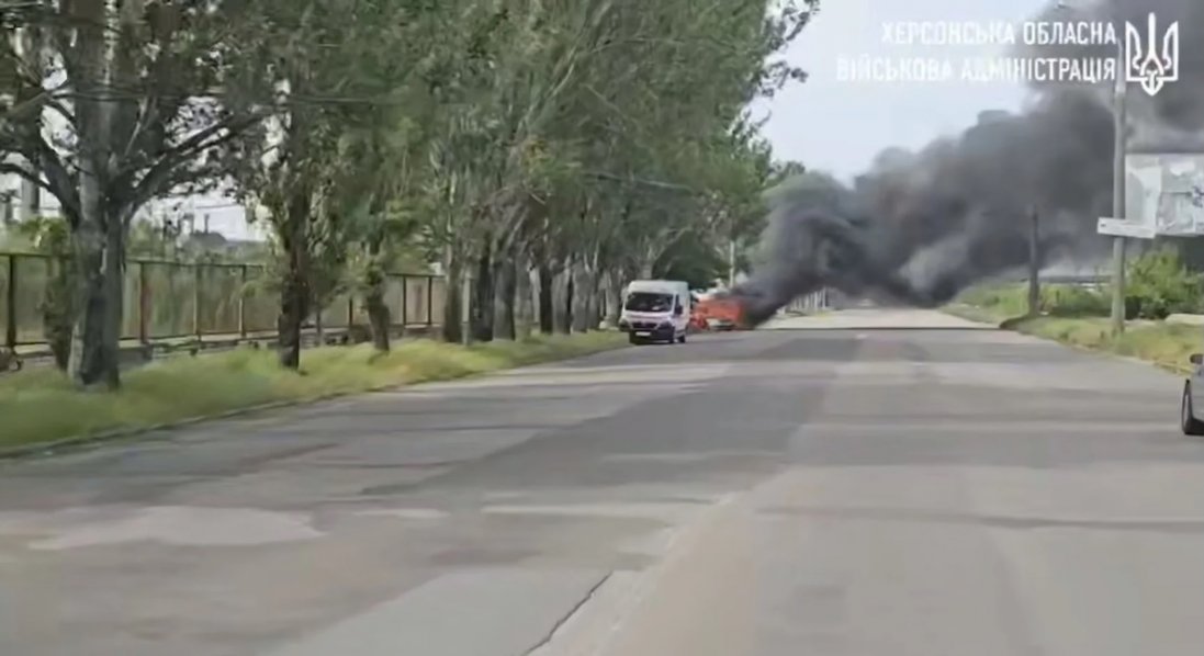 У місті Херсон близько 10:30 російські військові скинули вибухівку з дрона на цивільний автомобіль, унаслідок чого машина загорілася.