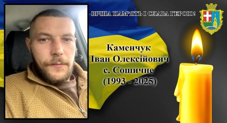 "З глибоким сумом повідомляємо, що на фронті загинув житель села Сошичне, Каменчук Іван Олексійович, 11.10.1993 року народження.