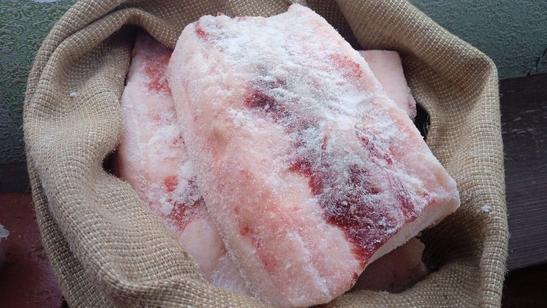 Як розповіла Тетяна Балабаш, її бабуся засолювала сало в мішку, бо не всі тоді мали бодні чи банки. На дно мішка насипали сіль. Кожен шматок сала ретельно обвалювали в солі з усіх боків і складали в мішок. Раніше сало в мішку ще й змочували оцтом — для кращого смаку й довшого зберігання.