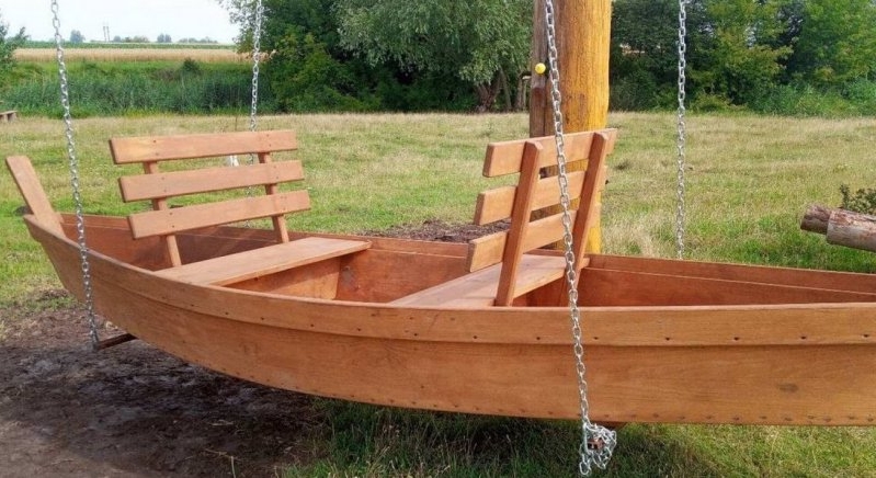 Гойдалка — це масивна дерев’яна конструкція з човноподібною лавкою, розрахованою на чотирьох осіб (по двоє з кожного боку). Вона витримує значне навантаження, а в темну пору доби підсвічується жовто-блакитним світлом.