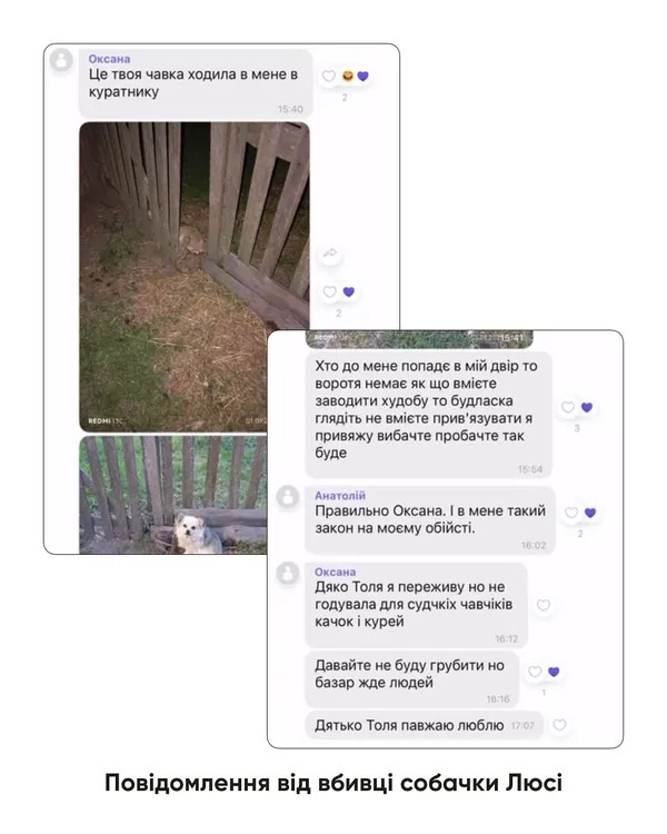 А вже 4 липня мешканка с. Цміни відкрито повідомила в чаті, що вбила собаку, надіславши фото мертвої тварини.